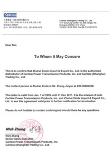 珠海市信德进出口有限公司是德国马牌(CONTITECH)工业皮带,汽车皮带,工业用的橡胶管,空气弹簧,橡胶工业产品授权中国代理商。 法国哈金森(HUTCHINSON)工业皮带(POLY-V多楔带)授权中国代理商。 美国卡莱(CARLISLE)工业皮带授权中国代理商。美国马丁(MARTIN)皮带轮、联轴器、链轮代理商。杜克(DUK)传动产品总经销。